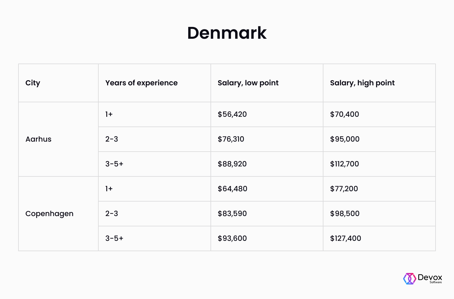 Poland is in the middle of the programmer’s salaries ranking. A novice employee can expect $49K a year, a more experienced one — $59K, while experts earn around $74K.
