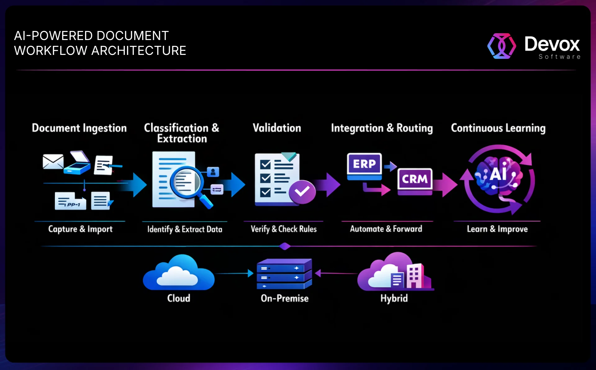 Deployment stays flexible. Depending on security, compliance, and integration needs, IDP can be run as SaaS, on-premises, or in a hybrid model.