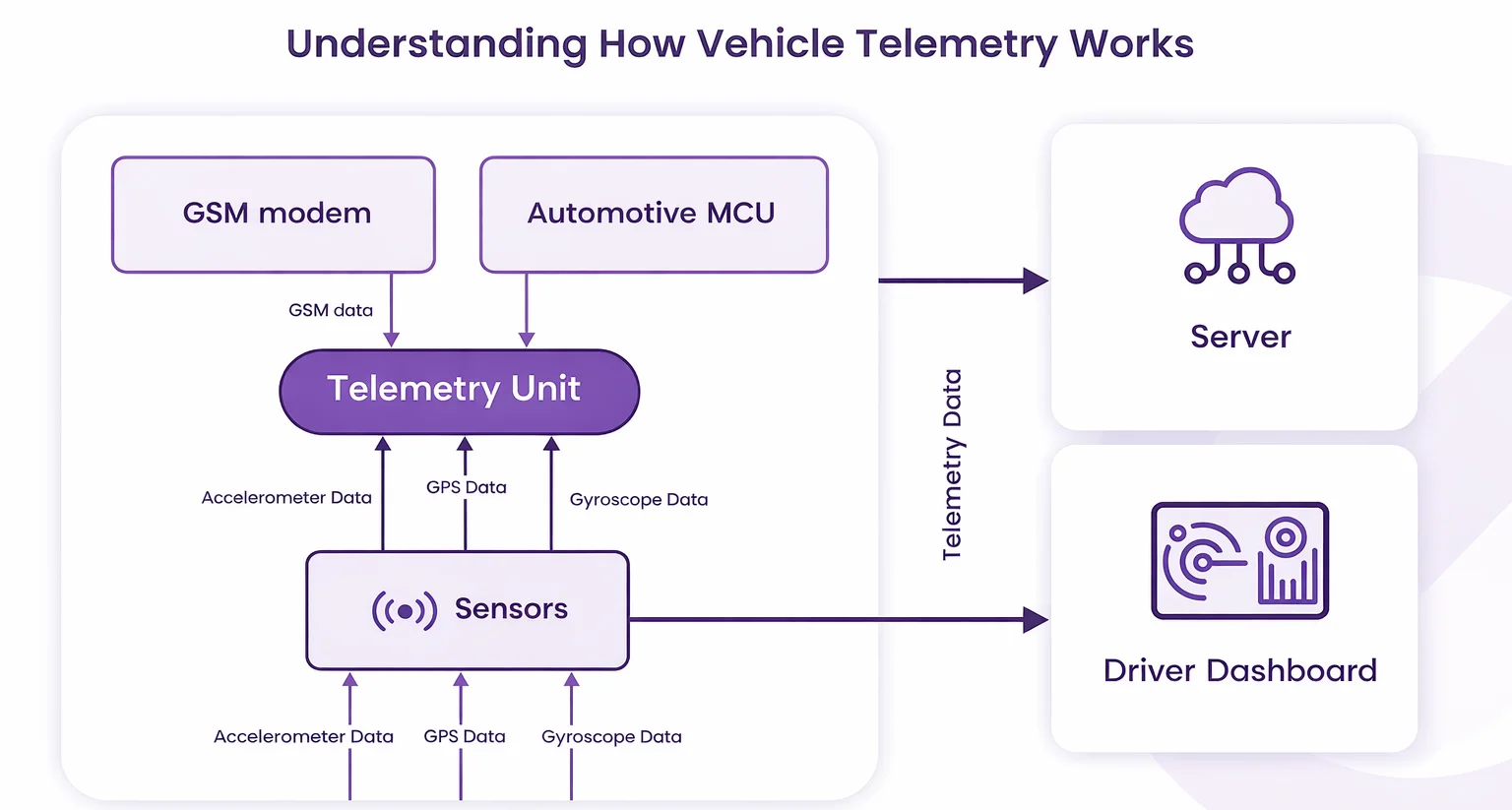 Simply put, telemetry vehicle systems transform physical vehicle activity into structured digital signals, so cutting-edge tech systems could improve driving. A modern vehicle telemetry system consists of five core layers as follows: