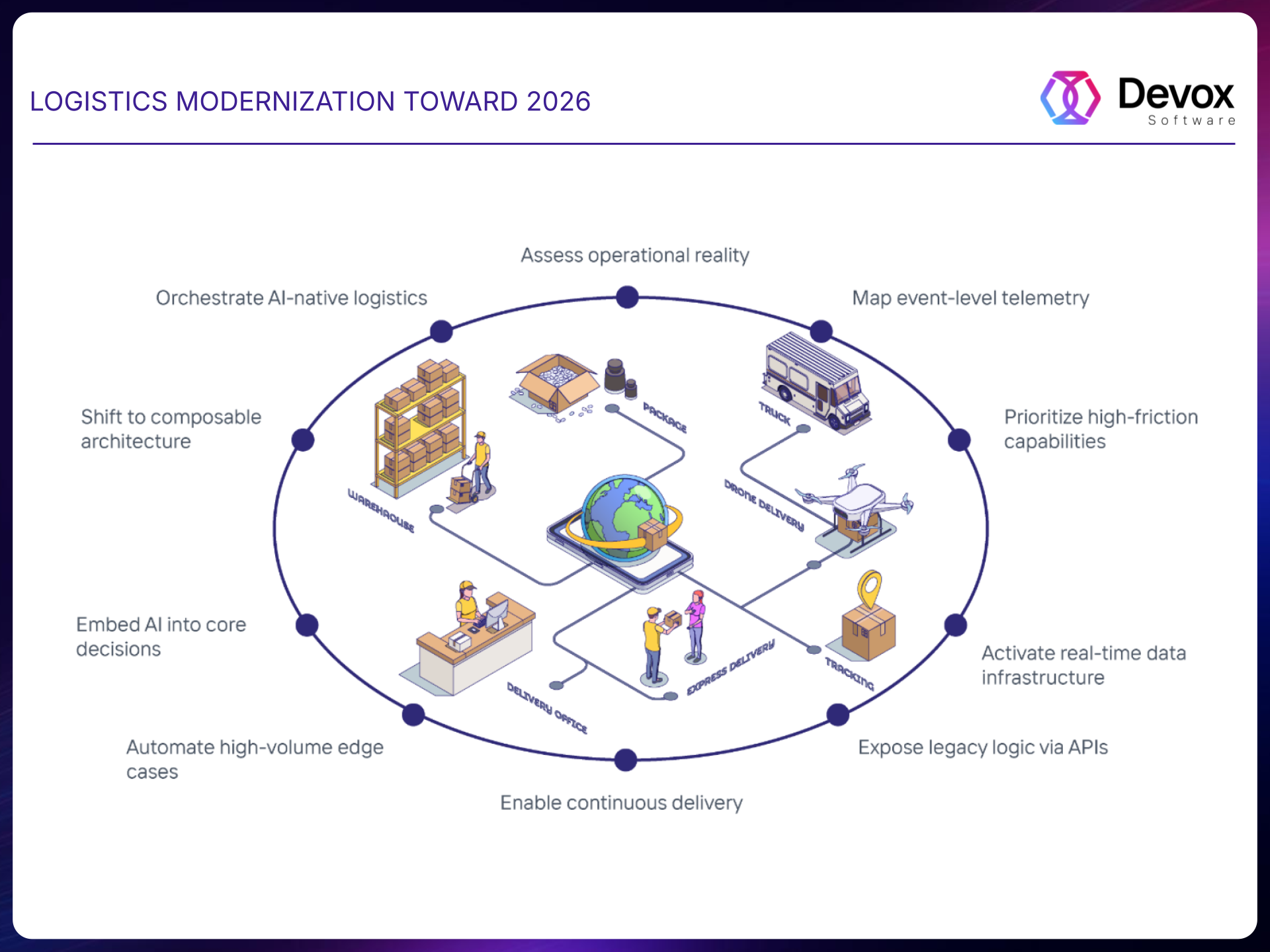 Modern logistics transformation requires more than just new technology. It demands a controlled move from fragmented legacy systems to AI-driven supply chains — without disrupting live operations. This roadmap is a pragmatic path to modernization, balancing system stability with automation and AI execution.