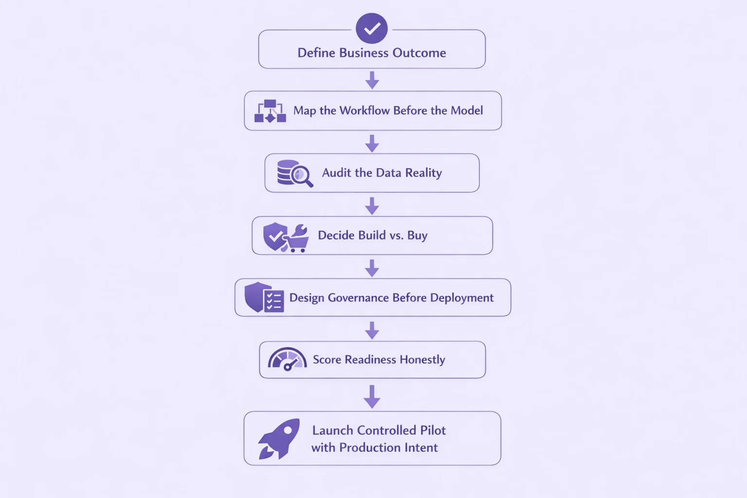 - Map the workflow before the model. Define the process, exceptions, handoffs, and approval logic before choosing a model.