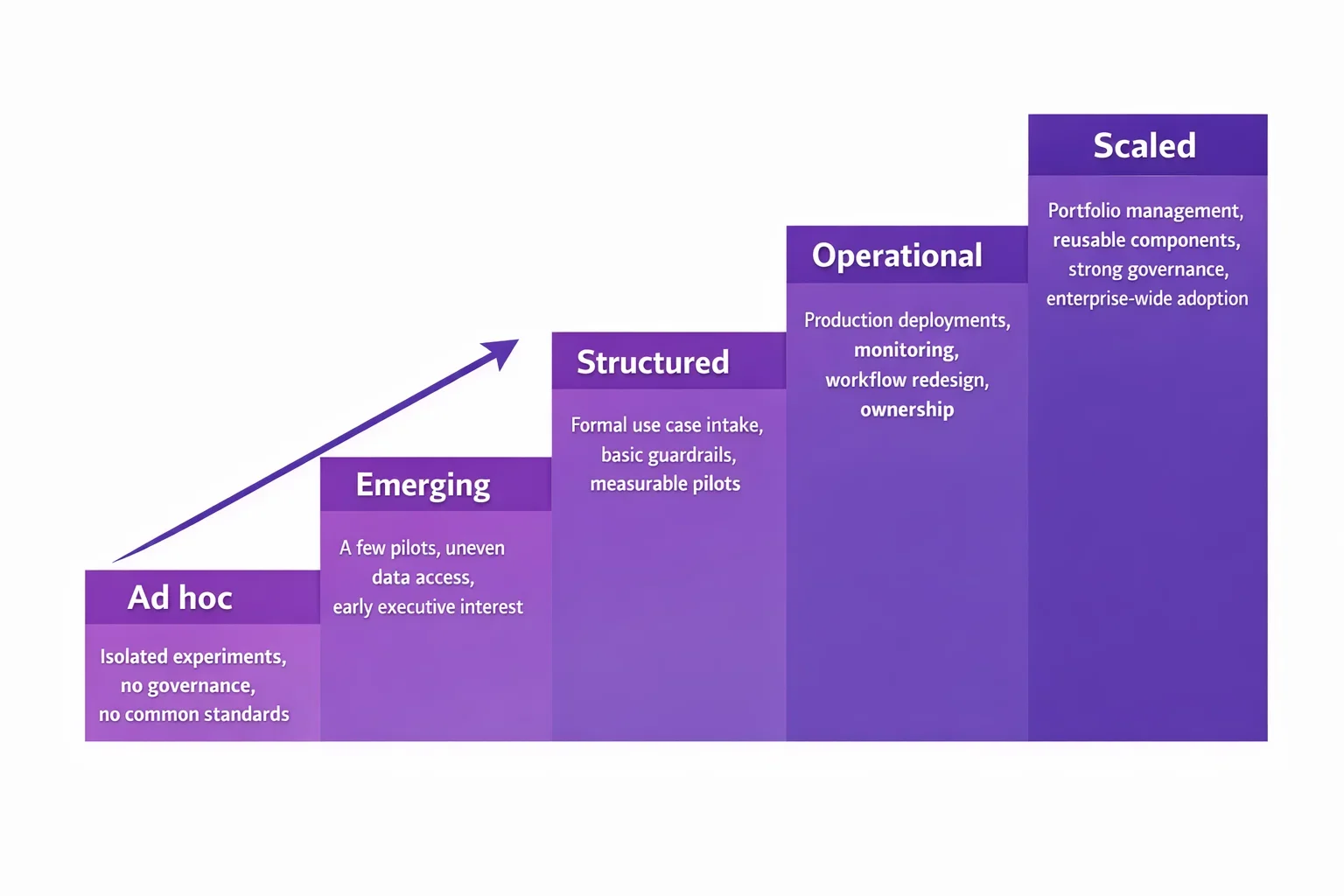 | Strategy and value | Clear use cases, business owner, KPI baseline, ROI hypothesis | Sponsor, target metric, prioritization logic | 0–5 |